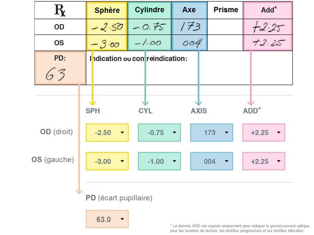 Pour l’ADD, c’est l’addition de correction qu’il faut ajouter à la vision de loin pour obtenir la vision de près, toujours avec un + devant le chiffre.